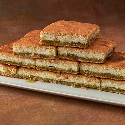 Farina Base cookie dough stuffed with layer of ashta* and a layer of pistachio paste.