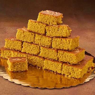 Turmeric cake masked with vanilla flavor topped with almonds.